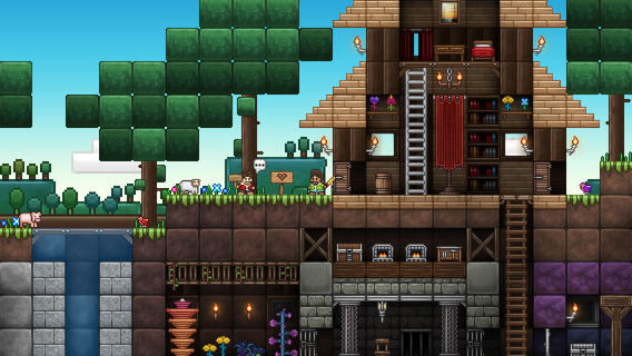 第一类:人物的走动上,游戏一改 Minecraft 一类的四个方向总动,变成了水平方向的走动,不仅省去了摇杆的麻烦,而且在地图挖的千疮百孔的时候也不至于晕了头,毕竟在 iOS 系统上,要做得和 PC 一样复杂对用户是很不友好的,比如 Minecraft PE;